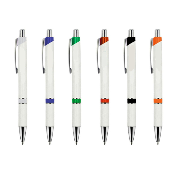 Bolígrafo retráctil de cuerpo color Blanco con sofisticados detalles de color. Posee clip metalizado brillante y botón metalizado brillante también con detalle de color. Se imprimen por proceso tampográfico o impresión full color con tintas UV. Tinta de escritura negra.