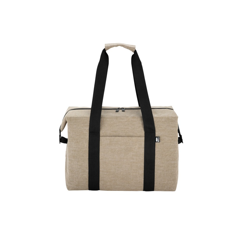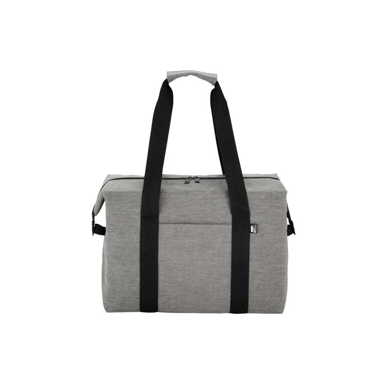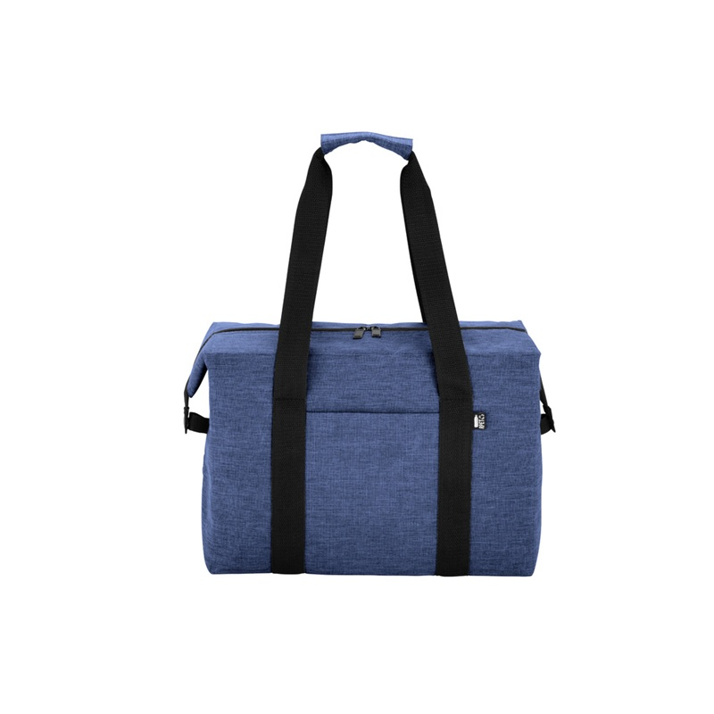 Bolso térmico. Cierre posterior con dos tiradores. Hebillas metálicas en los laterales que permiten cambiar su formato a prisma. Bolsillo frontal. Dos asas con refuerzo de velcro. Material: Exterior de poliéster 300D recubierto de RPET. Interior de espuma de polietileno recubierto con láminas de aluminio. Medidas: 37,5x20x26cm. Capacidad: 19 litros.