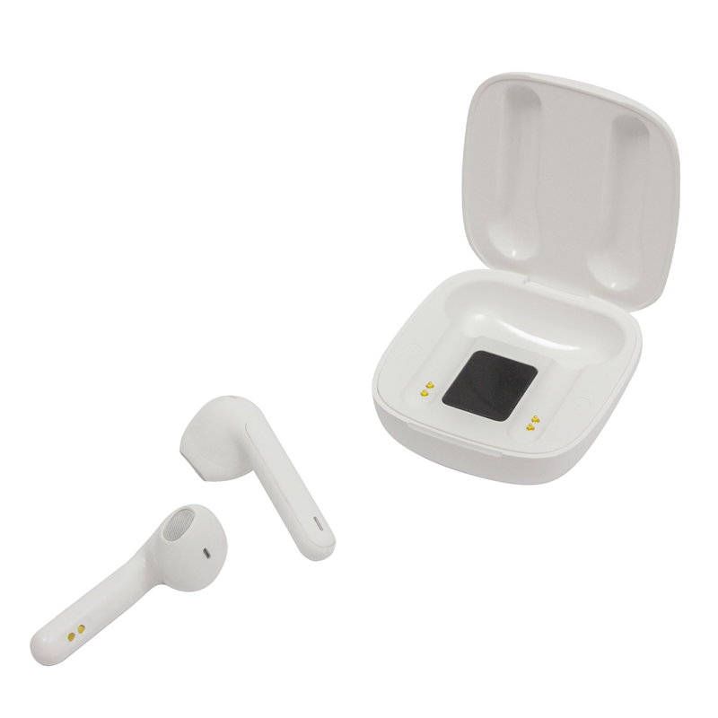5,5 cm x 5 cm x 2,5 cm. (medida de la caja) 45 mm (auriculares). Plástico ABS. Auriculares bluetooth con imán, se conectan al celular de forma inalámbrica. Los auriculares cuentan con función touch en cada costado de los audifonos (izquierdo y derecho) para funciones de encendido, apagado, avance, retroceso, reproducción y pausar musica. Así como también para las funciones de responder, rechazar o finalizar una llamada. Estuche que permite cargar la batería de los auriculares. Indicador de batería del estuche. Base de carga 300 MAH . Auriculares: 30mAh Bluetooth V5.0. Rango de alcance 10 metros. Tiempo de reproduccion autónomo 3 horas aprox. Tiempo de carga de la batería 1 hora. Cable de carga USB tipo C. Duración de la batería en modo stand by: 40 hs.