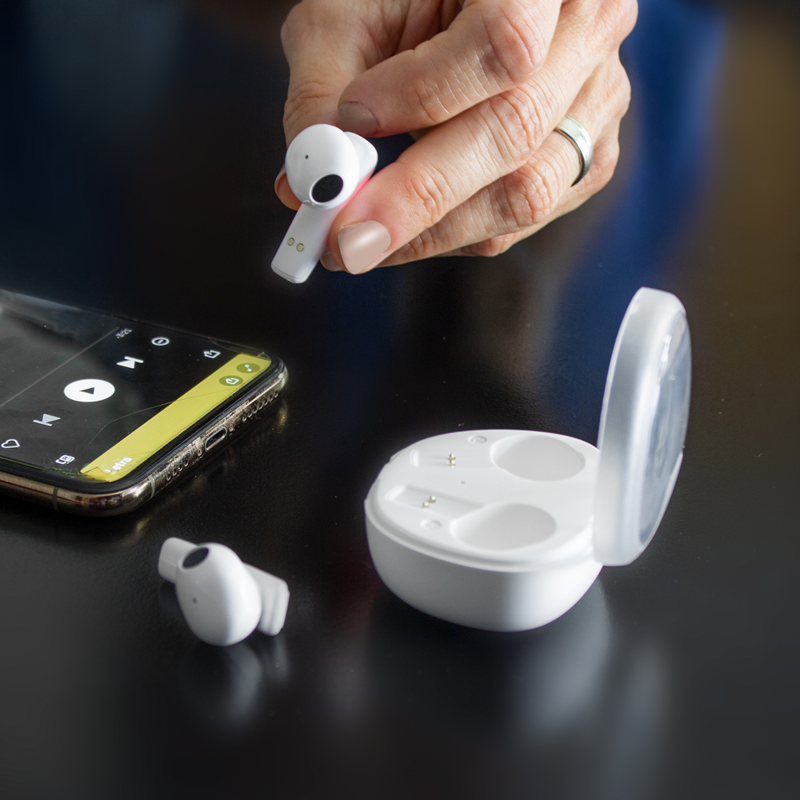 5,5 cm x 5 cm x 2,5 cm. (medida de la caja) 3 cm (auriculares). Plástico ABS. Auriculares bluetooth con imán, se conectan al celular de forma inalámbrica. Función táctil de encendido, apagado, avance, retroceso y pausa. También permite responder, rechazar o finalizar una llamada. Estuche con indicador luminoso que permite cargar la batería de los audifonos. Capacidad de carga: 200 mAh. Capacidad de batería de litio por auricular: 30 mAh. Bluetooth V5.0. Rango de alcance: 10 metros. Tiempo de reproduccion autónomo: 3h aprox. Tiempo de carga de la batería: 2h. Cable de carga USB tipo C