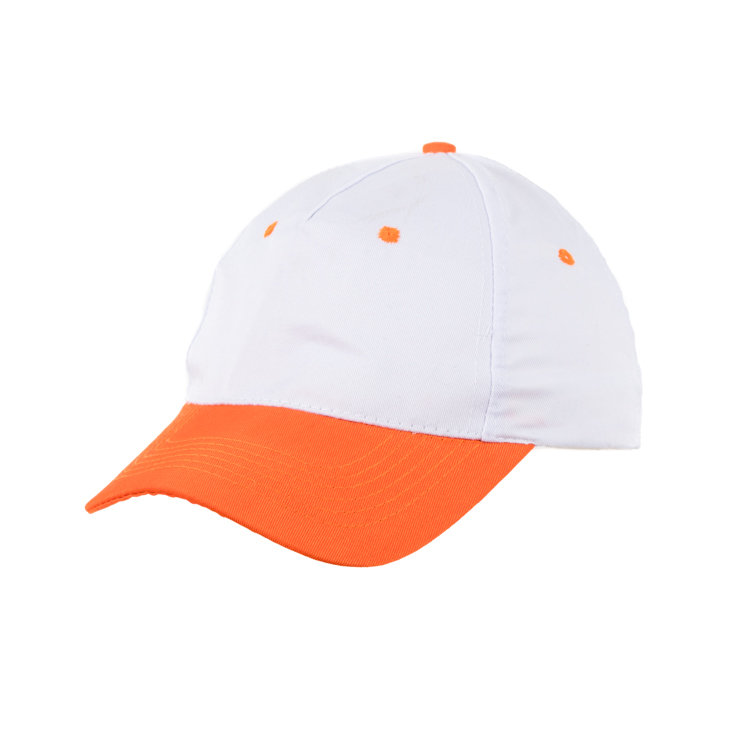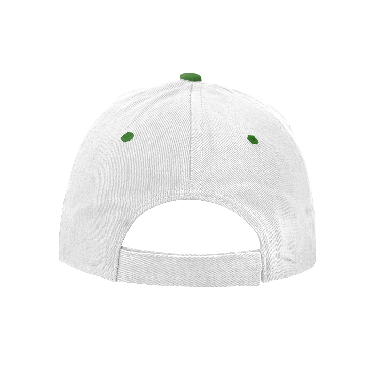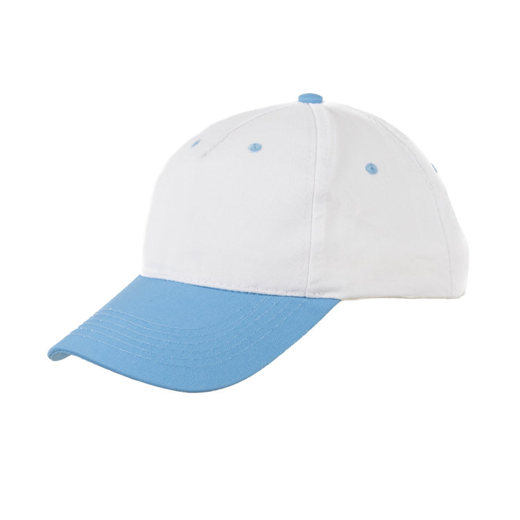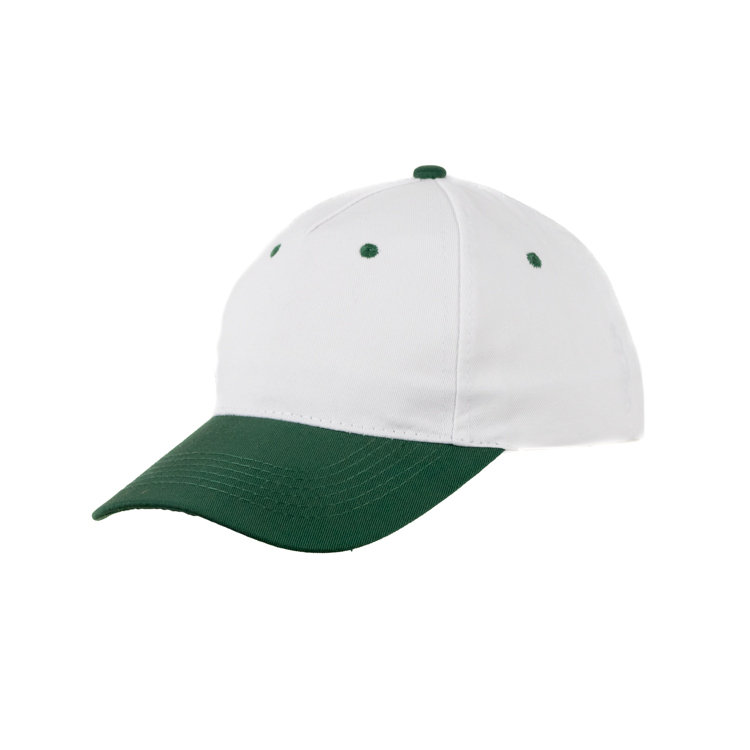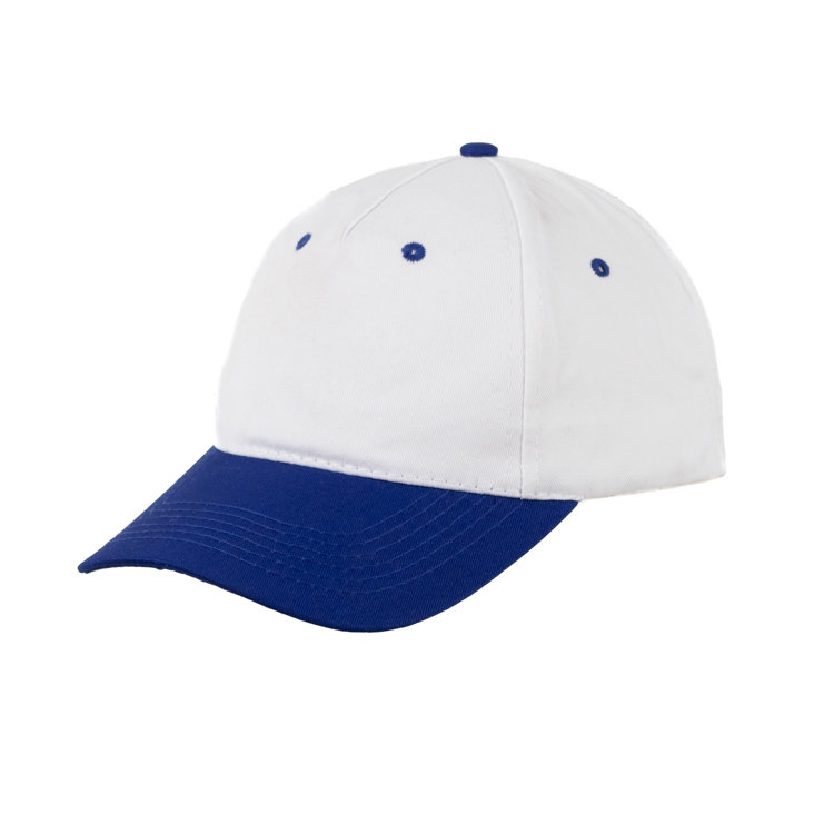 Gorro de gabardina, combinado de visera de color casco blanco, 5 gajos de algódón y poliéster con 6 ojalillos bordados y botón forrado al contratono. Medida única, regulable con tira de velcro.