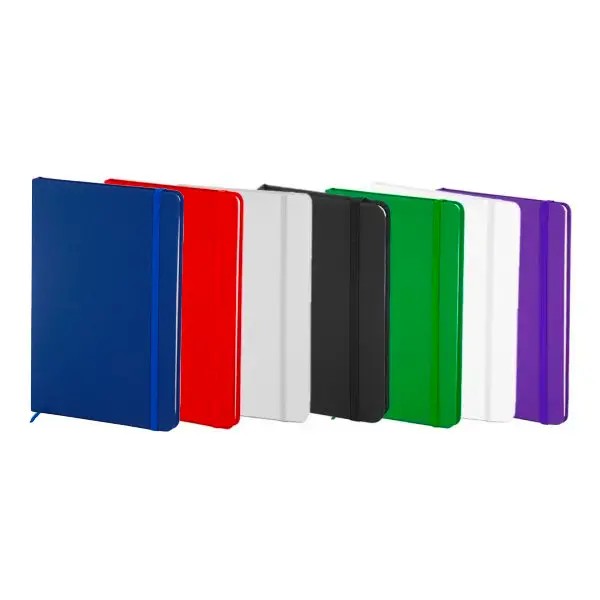 Libreta de tapa dura en diferentes colores. Contiene 96 hojas rayadas de 70 gramos. Posee cierre con banda elástica y separador en tela del mismo color que la tapa.