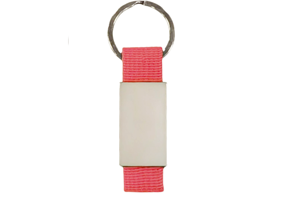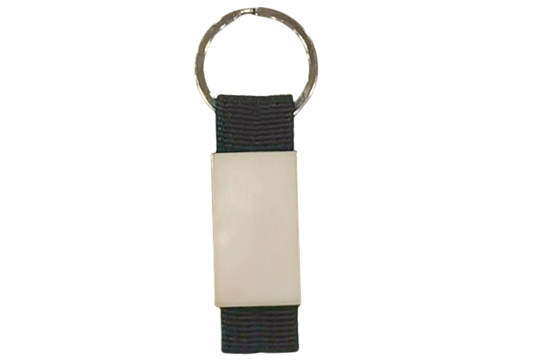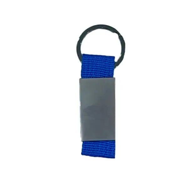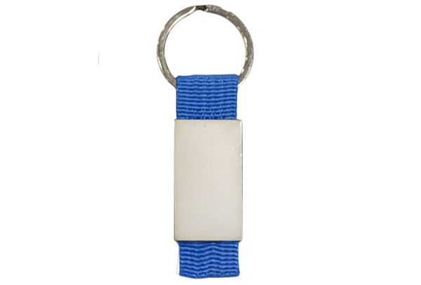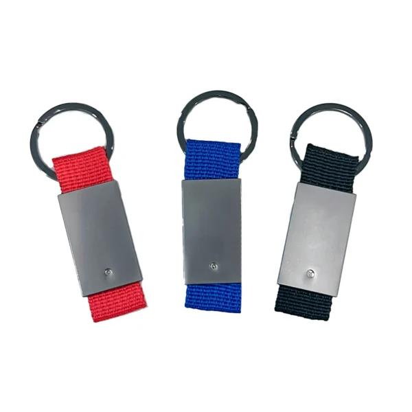 Llavero Acero «FlexTag» con cinta de tela, disponible en negro, rojo y azul. Personalizable con UV y UV DTF full color en una cara. Ideal para promociones y regalos empresariales.