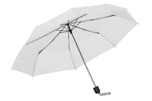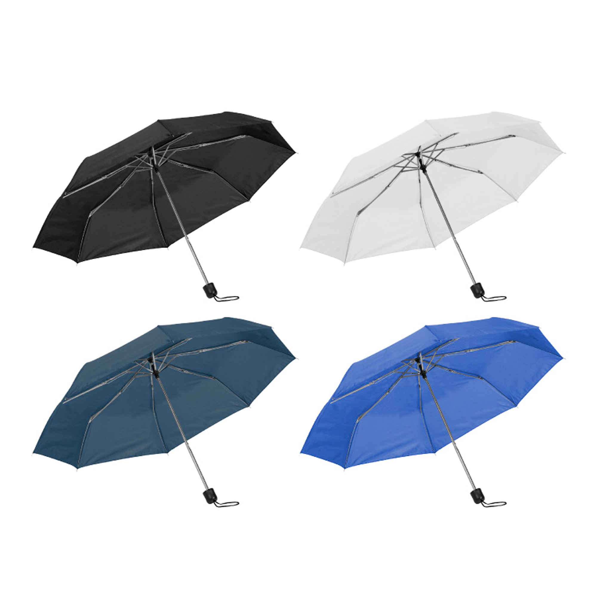 Práctico, compacto y fácil de llevar. Paraguas de apertura y cierre automático, con eje y varillas metálicas para mayor resistencia. Mango de plástico engomado negro con correa de cordón a tono y botón a presión para un uso ágil.